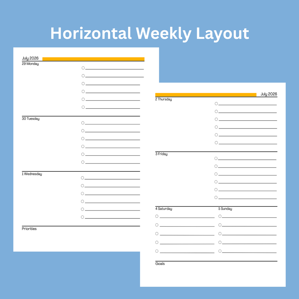 Our Best Seller Weekly Planner includes two-page Weekly and two-page Monthly calendar spreads, productivity tools and create space, as well as sections for goal setting, life adjustments and planning ahead. All Planners come with a Durable Flexible High-Density Poly Spiral Coil ("Dura-Flex Coil"). Choose between Horizontal, Vertical or DUO (both Horizontal & Vertical) Planner Layouts.